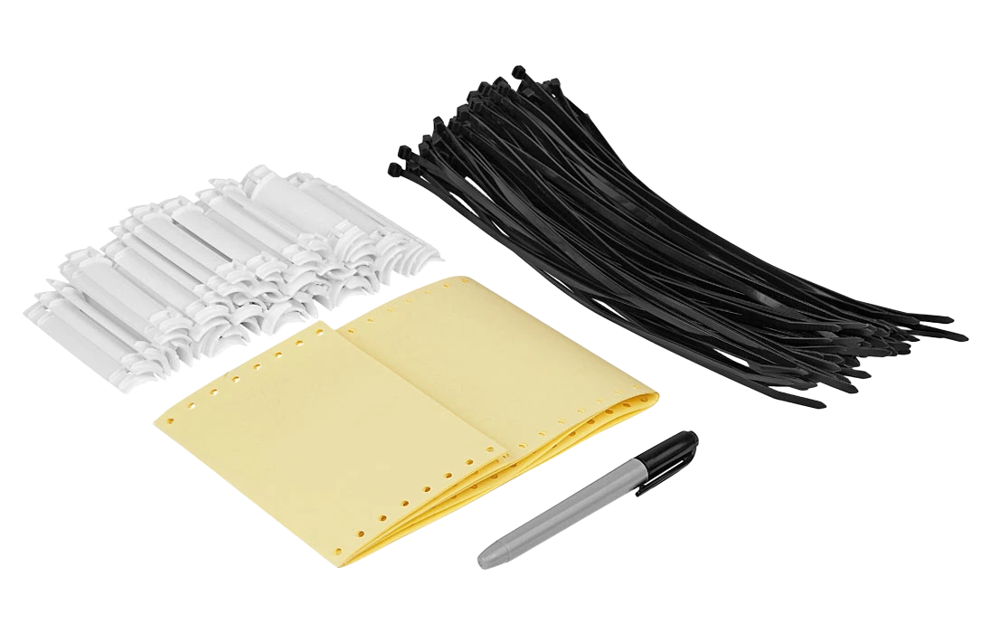 Поставляется наборами, состоящими из 20 пластмассовых бирок с проушинами, 20 самоламинирующихся маркеров для надписей, 40 пластмассовых стяжек длинной 250 мм и маркер-ручки перманентной для нанесения надписей.